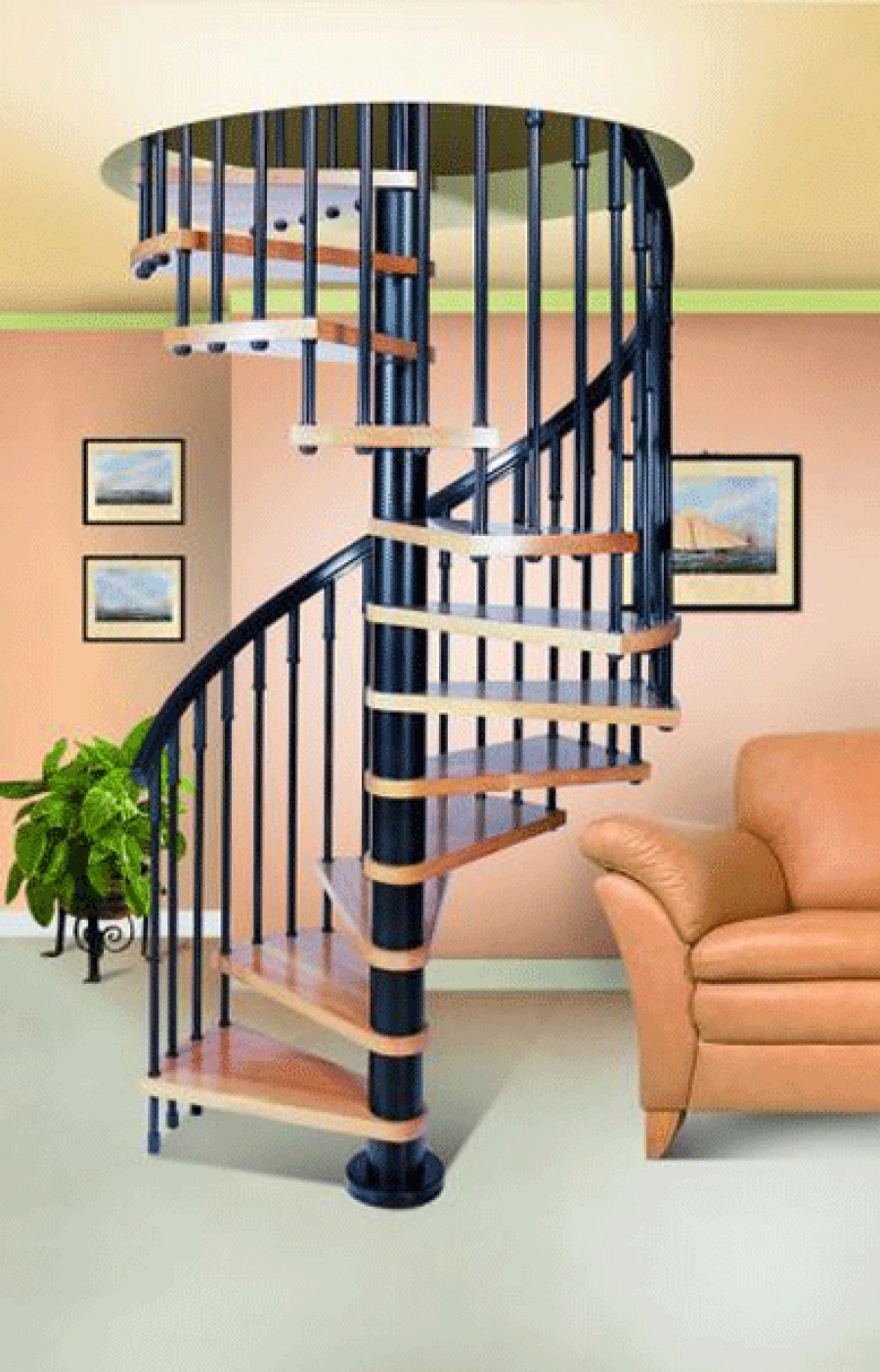 Σκάλα κυκλική ξύλινη με μεταλλικά κάγκελα και κουπαστή από PVC